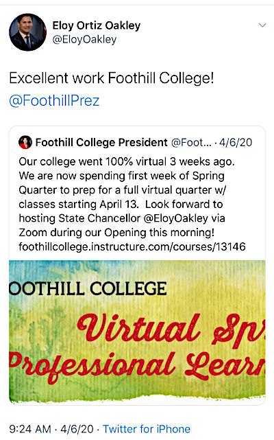 State Chancellor Eloy Oakley, as I previously mentioned, gave a special shout-out to Foothill for our Flex Week during his weekly webinar last week. He also tweeted this: