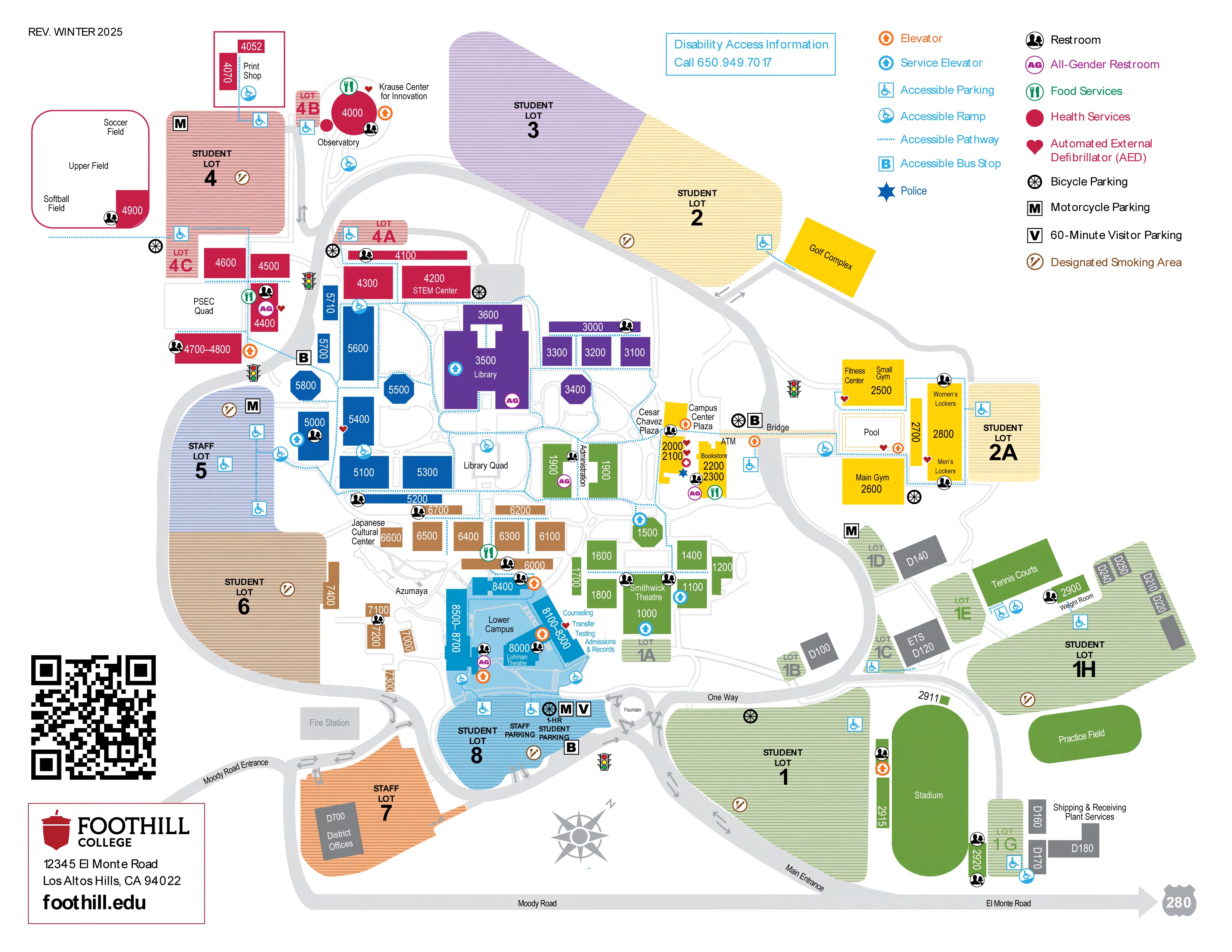 Accessible Routes on CampusTo find accessible parking, ramps, pathways and bus stops at Foothill College, please download our campus accessibility map. |